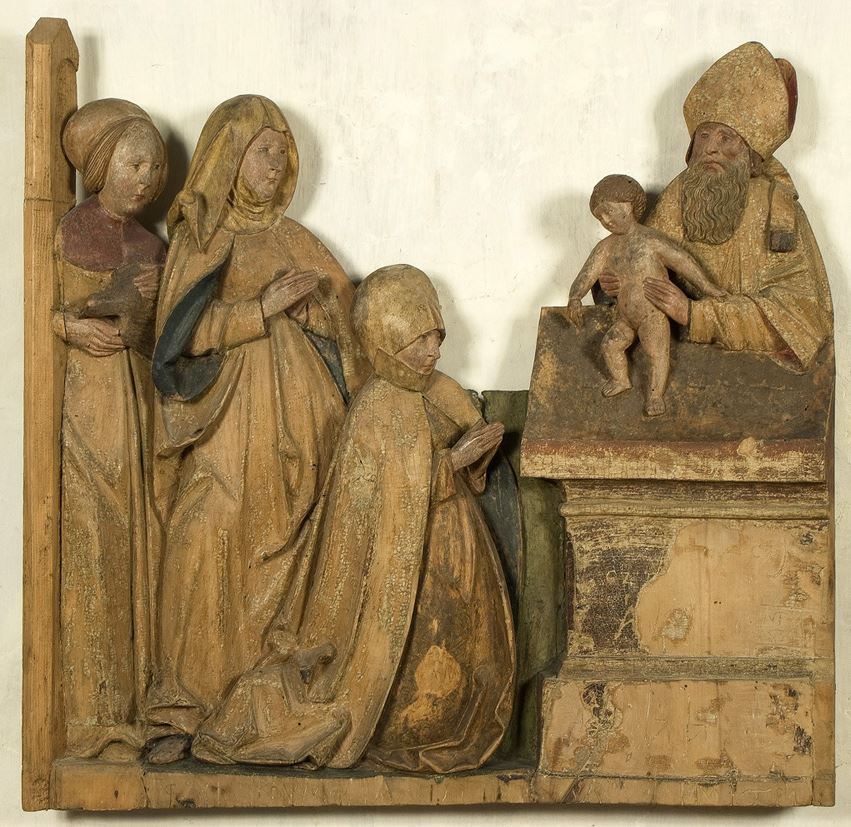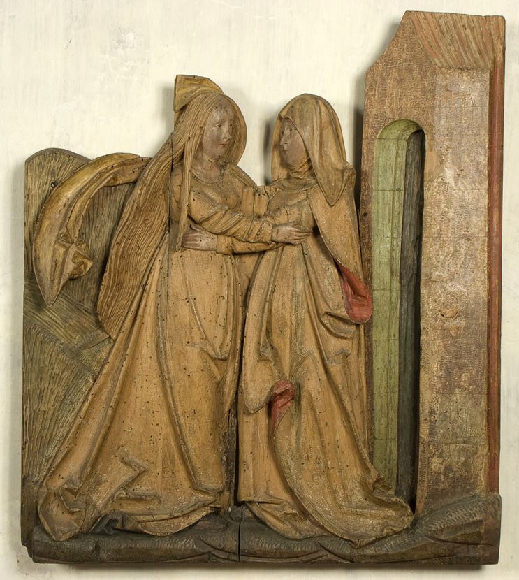 I due rilievi provengono dalla pieve della Natività di Maria a Varollo di Livo e facevano parte di un polittico a battenti smembrato. Essi raffigurano due storie della vita di Maria: nel pannello con la Visitazione, la Vergine e Santa Elisabetta si abbracciano accanto alla porta della città di Giuda; in quello con la Presentazione al Tempio si fronteggiano le donne in preghiera e il piccolo Gesù, sorretto dal vecchio Simeone sulla spoglia mensa dell’altare.