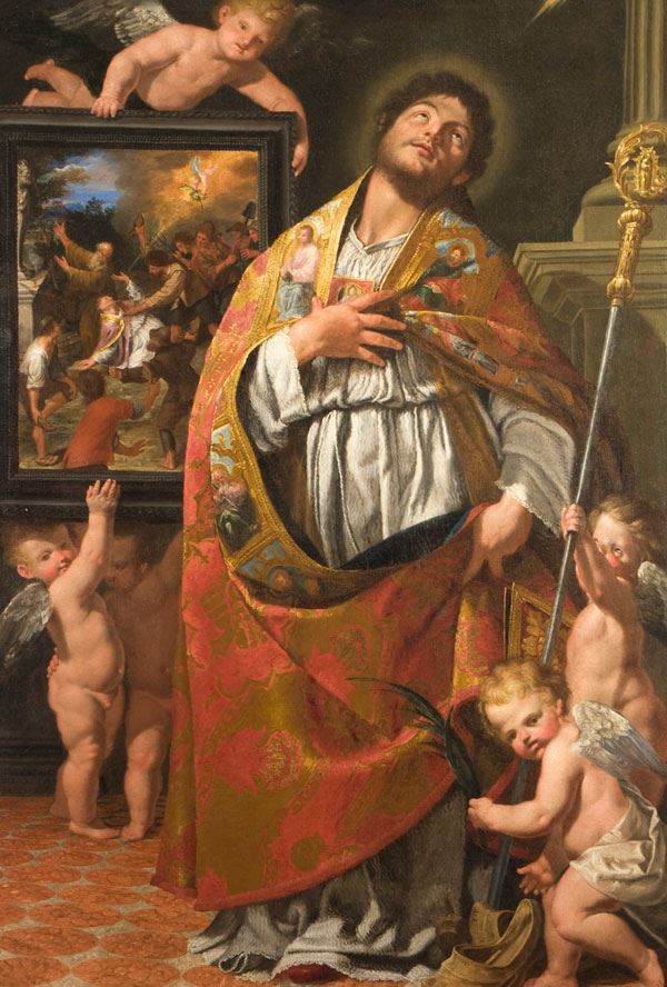 Nell'opera è raffigurato il santo patrono della diocesi di Trento in atteggiamento estatico, vestito in abiti pontificali e avvolto in un sontuoso piviale. Alcuni angioletti reggono i suoi attribuiti (lo zoccolo e la palma del martirio), le insegne vescovili (la mitria e il pastorale) e un quadro nel quale è rappresentato il suo martirio. L’ingegnoso espediente pittorico del ‘quadro nel quadro’ permette di associare in un’unica immagine l’estasi del vescovo alla prefigurazione del suo sacrificio.