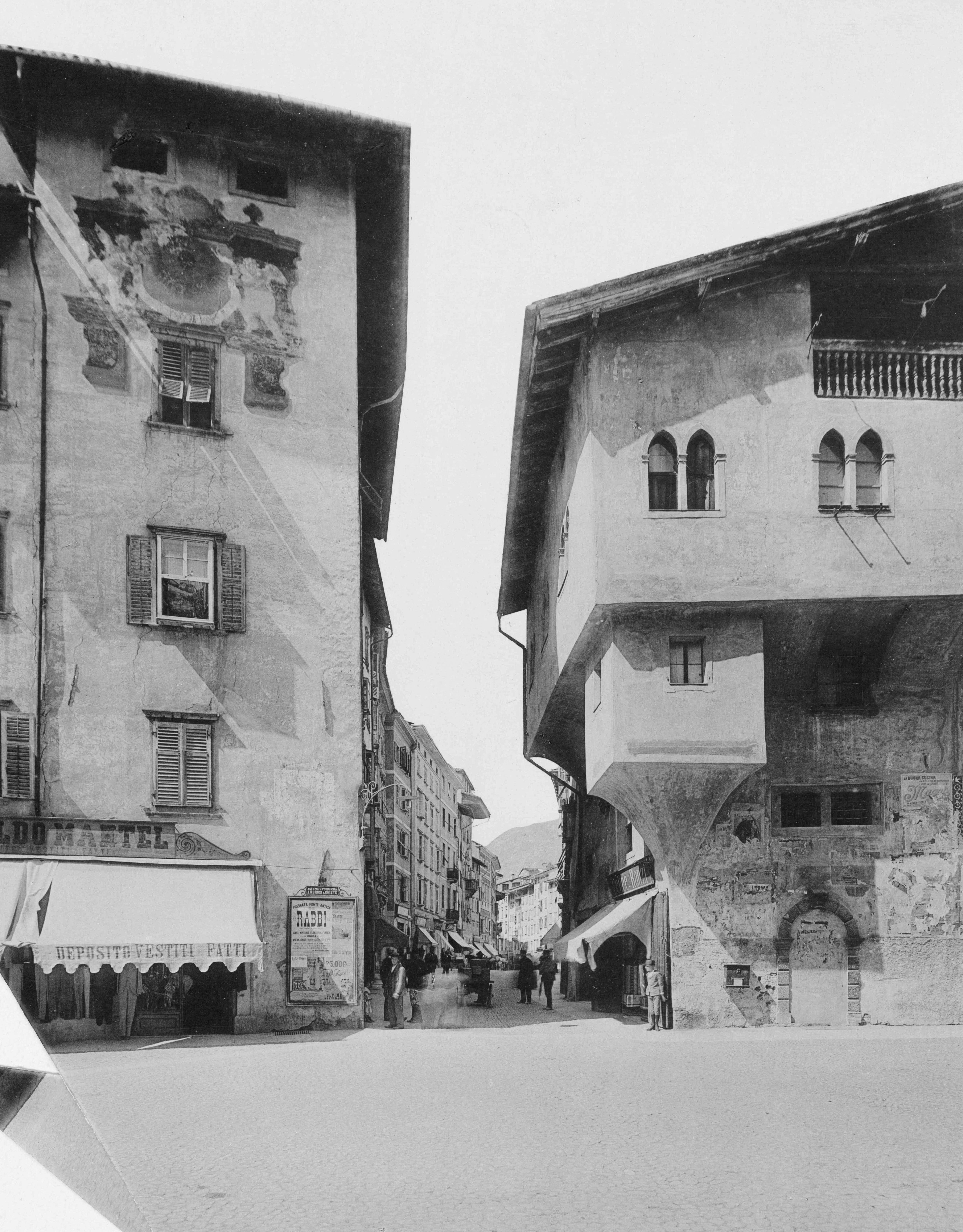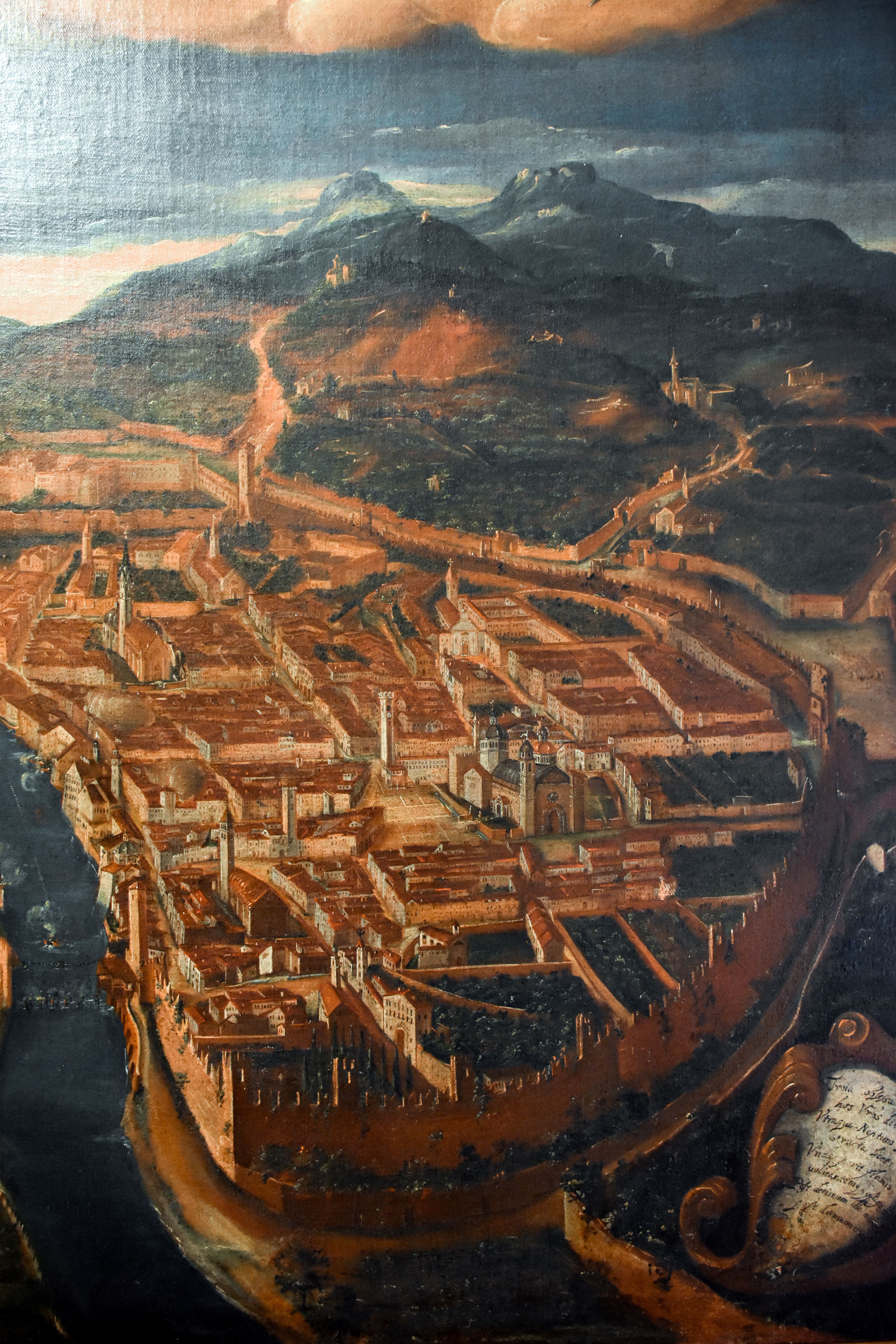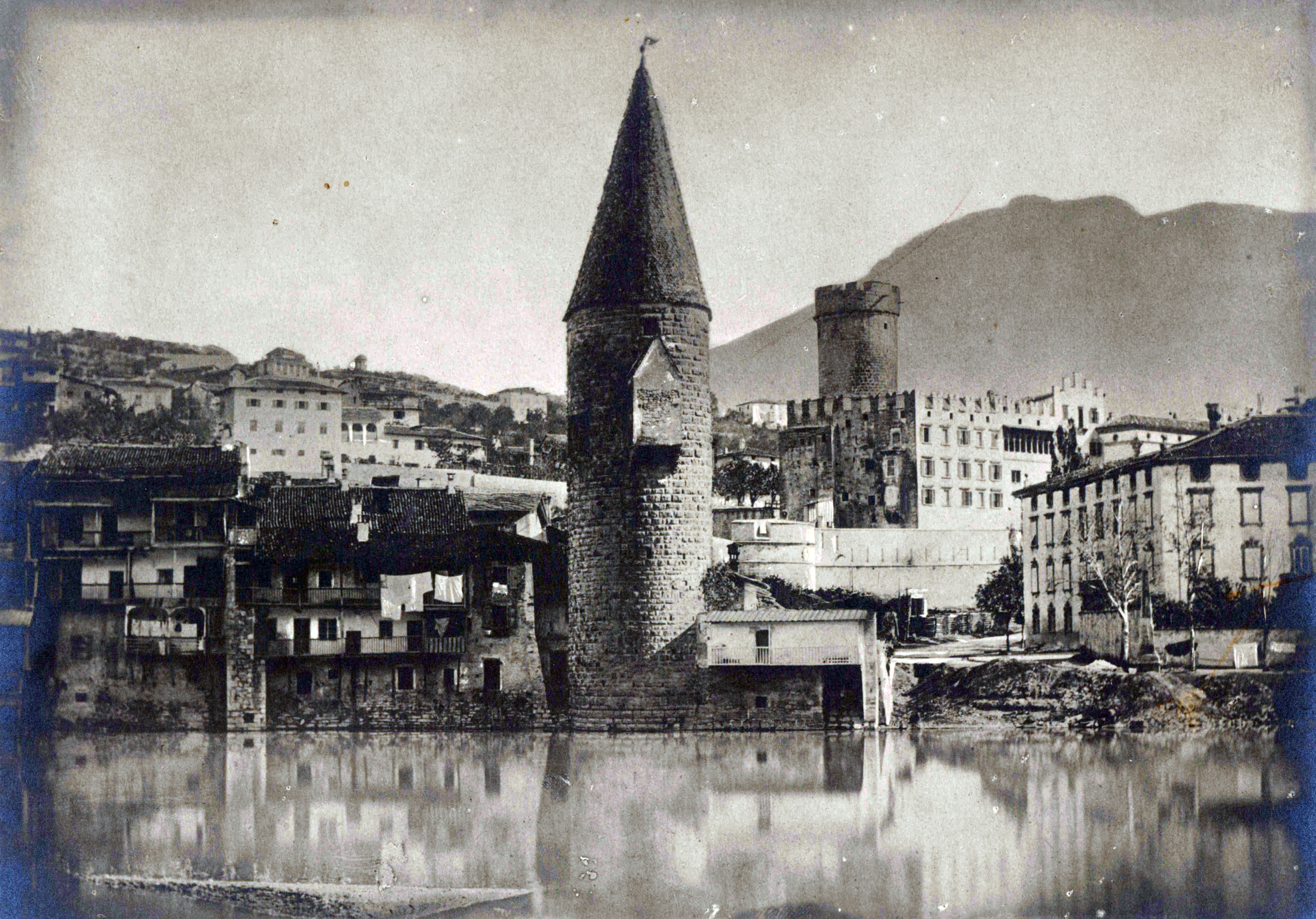 prints and paintings from the 16th-18th centuries that show the older face of the city of Trent, enclosed in crenellated medieval walls and protected to the north by the bend in the Adige River, rectified between 1854 and 1858.