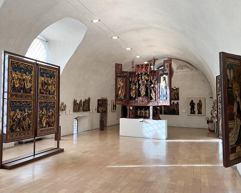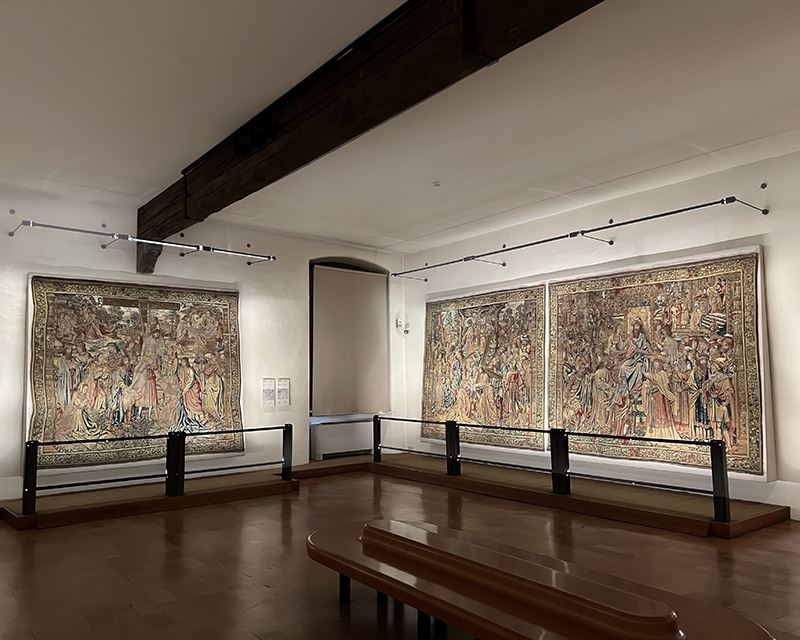 Al secondo piano si possono ammirare sontuosi arazzi fiamminghi, sculture lignee e altari a portelle di epoca tardogotica. Un suggestivo passaggio, inoltre, permette di osservare dall’alto l’interno della cattedrale di San Vigilio.
