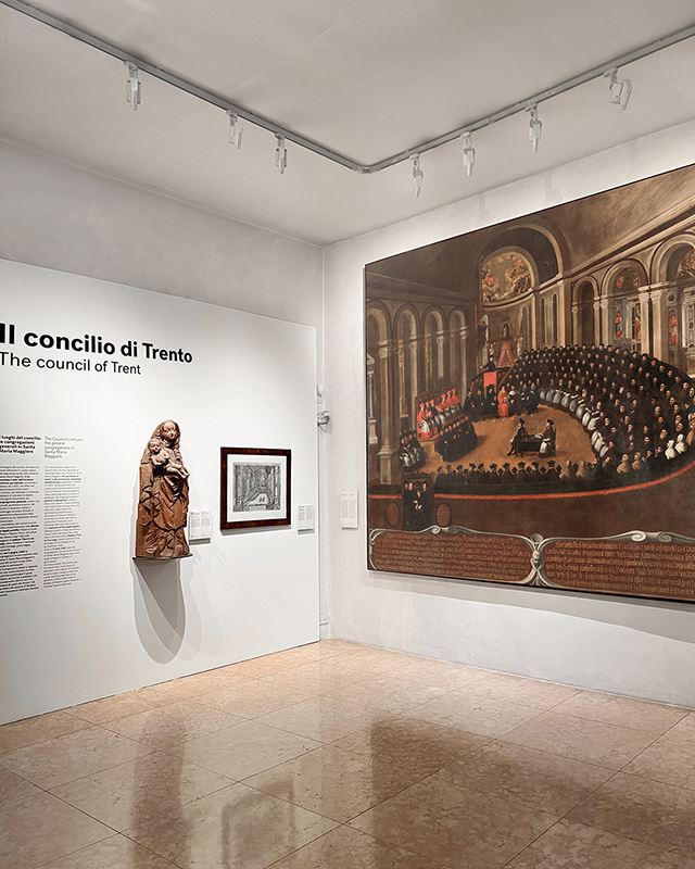 Il percorso espositivo si apre con la sezione dedicata all’iconografia del concilio di Trento, l’evento storico che ha segnato in maniera indelebile la storia città. I dipinti presentati al primo e al secondo piano documentano la ricca produzione artistica locale e il suo articolato rapporto con le aree limitrofe veneta, lombarda e tirolese. In uno degli ambienti della Torre di Piazza sono esposti alcuni raffinati codici miniati medievali.