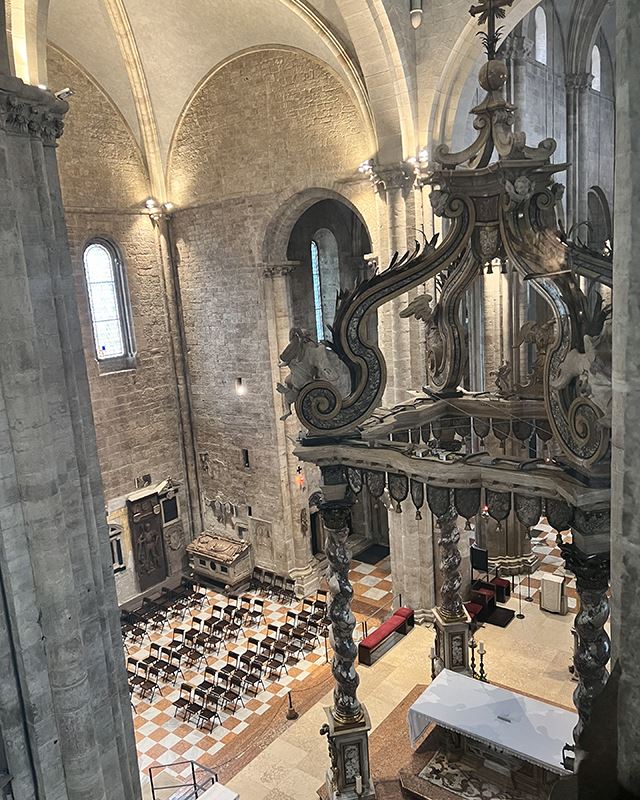 Nella galleria al terzo piano, infine, si susseguono ricchi paramenti liturgici, antichi ricami e preziose oreficerie. Il percorso termina nella scenografica sala del tesoro della cattedrale, dove spicca la grande urna processionale di San Vigilio.